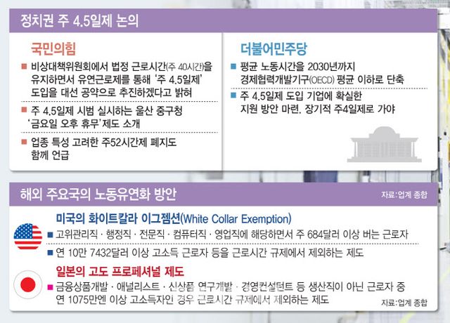 정치권에서 제안한 주 4일제, 4.5일제는 주 52시간 제도와 마찬가지로 전체 업종별 산업을 고려하지 않은 발상에서 시작한다. 기업의 R&D 직종은 또 고려하지 않았다. 국내 산업은 누가 키우고 발전시킬 것인가. 근로시간 제도 도입 여부는 법으로 정할 것이 아니라 기업 자율에 맡기는 것이 옳다.