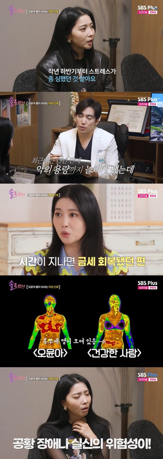 6일 방송된 SBS Plus·E채널 예능 '솔로라서' 18회에서는 오윤아가 한의원을 찾아 건강 상태를 점검하고, 절친 백지영과 힐링의 시간을 보내는 모습이 그려졌다.