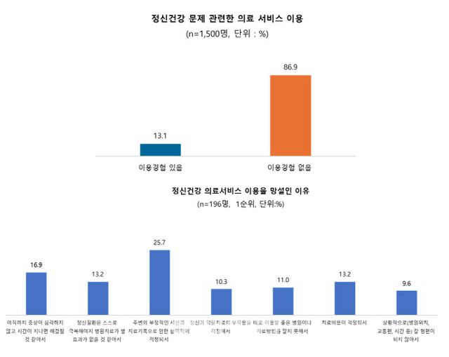 심지어 정신건강 의료서비스를 이용한 사람도 진료받는데 상당한 용기가 필요했다. 이들 중 69.4%가 ‘주변의 부정적 시선과 치료기록으로 인한 불이익이 걱정돼서’, ‘아직 증상이 심각하지 않고 시간이 지나면 해결될 것 같아서’ 등의 이유로 진료를 망설였다.