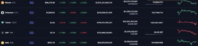 7일 글로벌 가상자산 시황중계 사이트 코인마켓캡에 따르면 이날 오전 8시 5분 기준 비트코인 가격은 24시간 전 대비 1.3% 오른 9만 6279달러에 거래됐다. 일주일 전과 비교하면 2.22% 올랐다. 알트코인(비트코인 외 가상자산)의 대표격인 이더리움은 전일 대비 0.8% 내린 1809달러에 거래됐다. 리플(XRP)은 0.16% 오른 2.14달러를 기록했다.
