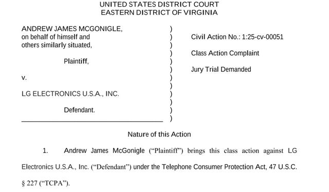 원고인 앤드루 제임스 맥고니글(Andrew James McGonigle)은 올해 1월 11일 LG전자 미국법인을 상대로 미국 버지니아 동부지방법원에 전화소비자보호법(TCPA) 위반을 주장하며 손해배상 소송을 제기했다. 현재 사건은 지난 4월 뉴저지 지방법원(사건번호 2:25-cv-02700, 담당판사 Susan D Wigenton 수잔 D. 위젠턴)DM로 이관돼 진행되고 있다.