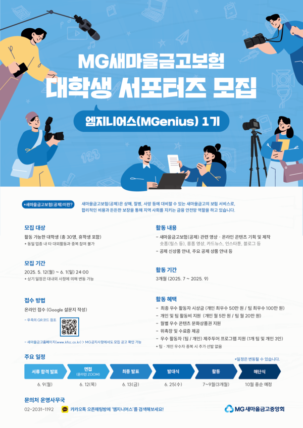 [포인트경제] 새마을금고중앙회가 2025년 새마을금고보험 대학생 서포터즈 “엠지니어스(MGenius)”를 모집한다고 밝혔다.
