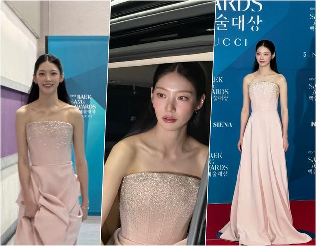 사진 속 공승연은 가녀린 어깨 라인을 드러내는 오프숄더 형태의 살구빛 드레스를 선택했다. 특히 드레스 상단 부분에 비즈 장식이 수놓여 화려함을 더했다. 공승연은 반묶음 헤어 스타일로 머리를 깔끔하게 넘겨 우아한 매력을 선보였다.