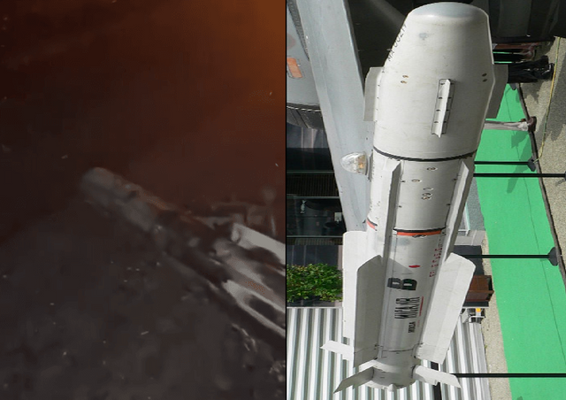 (왼쪽부터)파키스탄 국방부 측이 공개한 MICA 중거리공대공 미사일 잔해와 인도 공군 라팔 전투기가 운용하는 MICA 중거리공대공 미사일 원본. X(트위터) 캡처