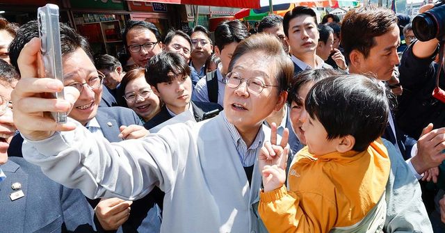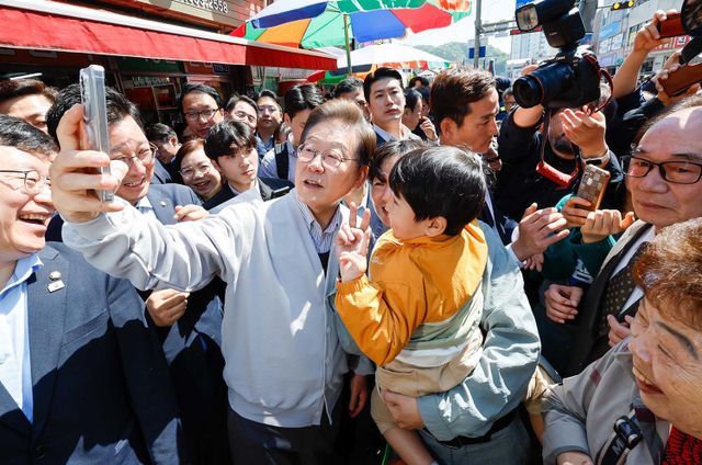 이재명 더불어민주당 대통령 후보가 2차 골목골목 경청투어 마지막 날인 7일 오전 전북 진안군 진무로를 찾아 어린이와 셀카를 찍고 있다. / 뉴스1