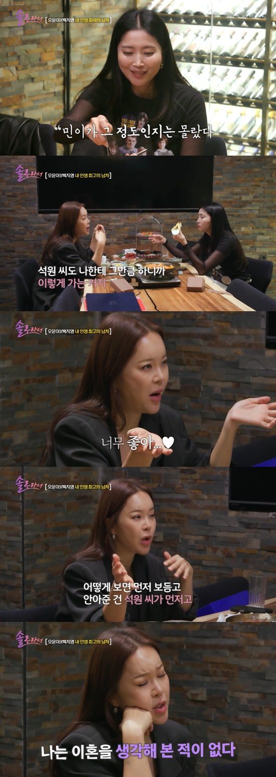 백지영은 남편 정석원과의 관계에 대해 "절대 일방은 없다. 다 쌍방이다. 내가 석원 씨한테 잘 하는 건 석원 씨도 나한테 그만큼 하니까 이렇게 가는 것"이라면서 "난 내 남편이 아직까지는 너무 좋다. 그 마음이 없으면 억지로 못할 것 같다. 아직은 너무 좋다. 좋아하는 만큼 하게 되는 것 같다"고 밝혔다.