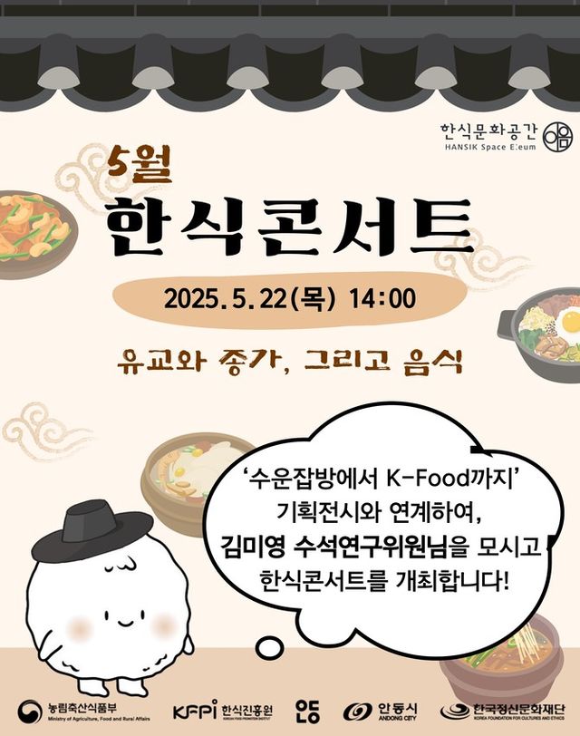 이번 한식콘서트는 한국국학진흥원의 김미영 수석연구위원이 강연자로 나서, 우리나라 종가 음식에 담긴 유교적 가치와 인문학적 의미를 쉽고 흥미롭게 소개할 예정이다. 또한 안동 음식을 주제로 한 기획전시 '수운잡방에서 K-Food까지'와 연계해, 참가자들은 더욱 풍성한 문화 경험을 누릴 수 있다.