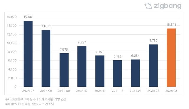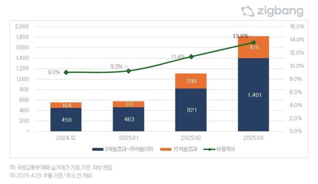 세부 구간별로는 △9억~15억 1401건(10.5%) △15억 초과 415건(3.1%)으로, 각각 전월 대비 71%‧43%씩 늘었다.