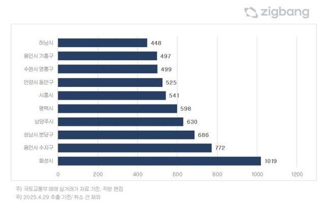 3월 거래가 많았던 지역으로는 △화성(1019건) △용인 수지구(772건) △성남 분당구(686건) △남양주(630건) △평택(598건) 등이 있다. 주로 강남권 접근성이 용이한 동시에 교통‧학군 등 탄탄한 인프라로 인해 실수요‧투자수요 유입이 꾸준한 지역들이다.