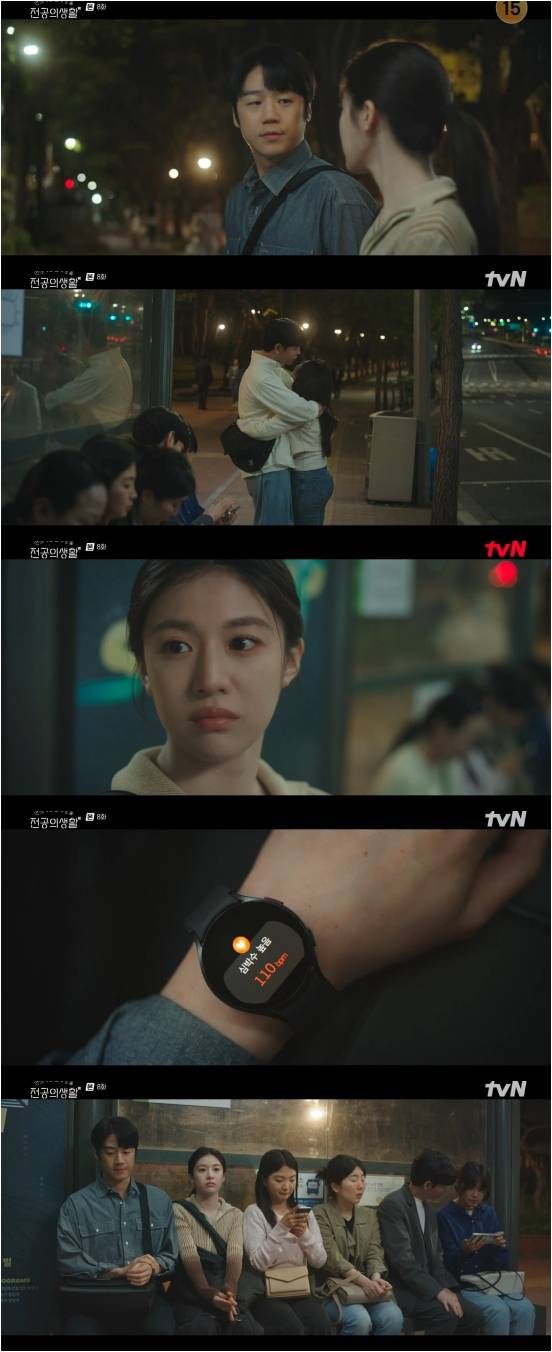 좁은 의자에 오이영과 바짝 붙어 앉은 구도원은 떨리는 마음을 온몸으로 내비치며 안절부절못해 보는 이들까지 두근거리게 했다. 갑작스러운 심장박동 상승을 경고하는 스마트워치 알림이 묘한 설렘을 자아내는 가운데 말없이 서로를 바라보는 두 사람의 진한 눈 맞춤으로 ‘언슬전’ 8회가 막을 내렸다.