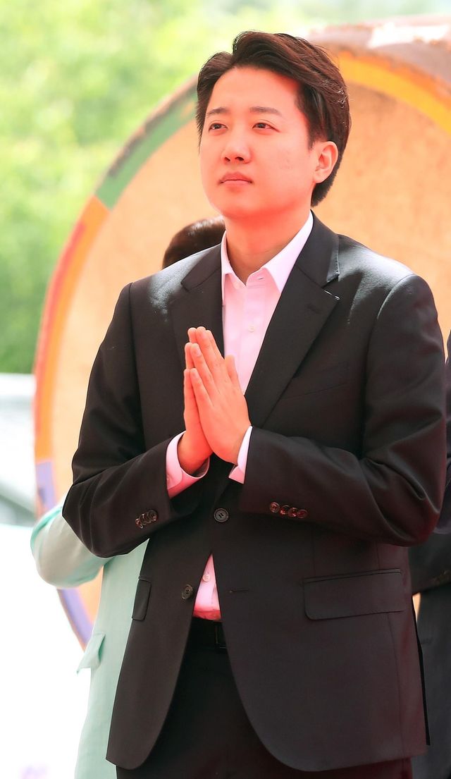 이준석 개혁신당 대선후보가 5일 대구 동화사 통일대불광장에서 열린 불기 2569년 부처님 오신 날 봉축대법회에 참석해 합장하고 있다. / 뉴스1