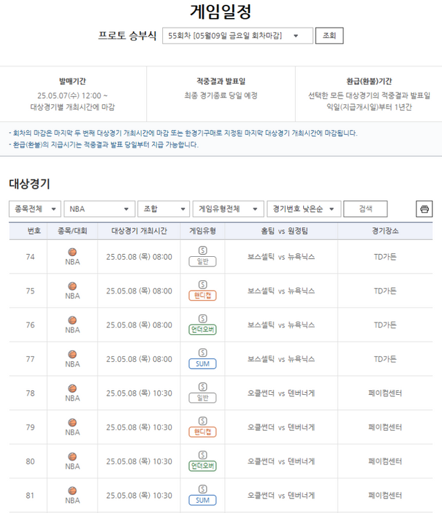 이번 프로토 승부식 55회차에서 2024-25시즌 NBA 플레이오프 2차전을 대상으로 하는 경기는 5월 8일에 열리는 보스턴셀틱스-뉴욕닉스(74~77번), 오클라호마시티썬더-덴버너게츠(78~81)전이다.