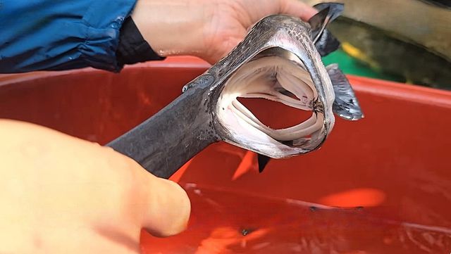 대형 수조로 옮겨지는 패들피시 / 유튜브 'TV생물도감'