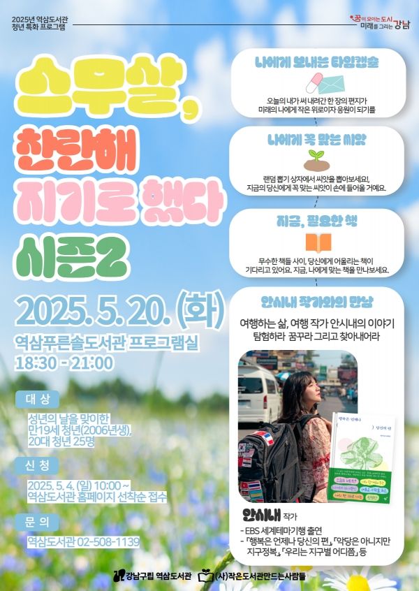 강남구립역삼도서관이 성년의 날을 맞아 올해 성인이 된 이용자들을 위한 프로그램 ‘스무살, 찬란해지기로 했다 시즌2’를 오는 20일 오후 6시 30분 진행한다.