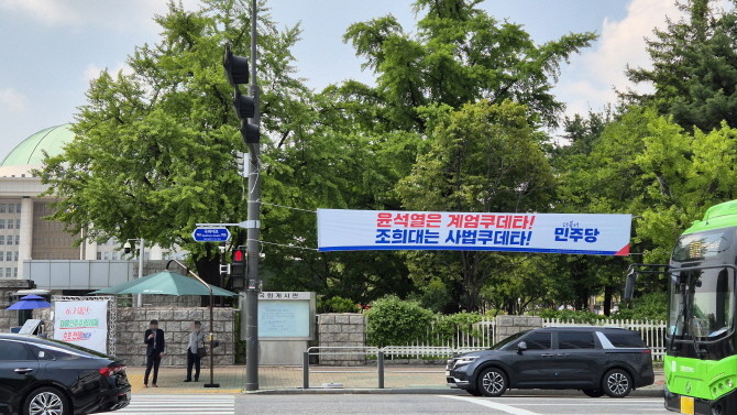 국회 앞에 걸려있는 더불어민주당 현수막. = 조택영 기자