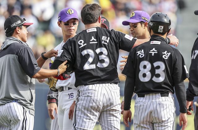 한동안 일어서지 못한 오스틴은 트레이너와 통역의 부축을 받고 더그아웃으로 들어갔다. 오스틴은 수비 방해가 인정돼 아웃 처리됐다.