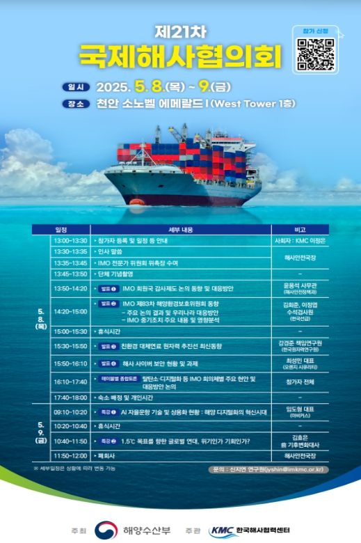 [파이낸셜경제=김예빈 기자] 해양수산부는 5월 8일과 9일 이틀간 천안에서 ‘제21차 국제해사협의회’를 개최한다고 밝혔다.