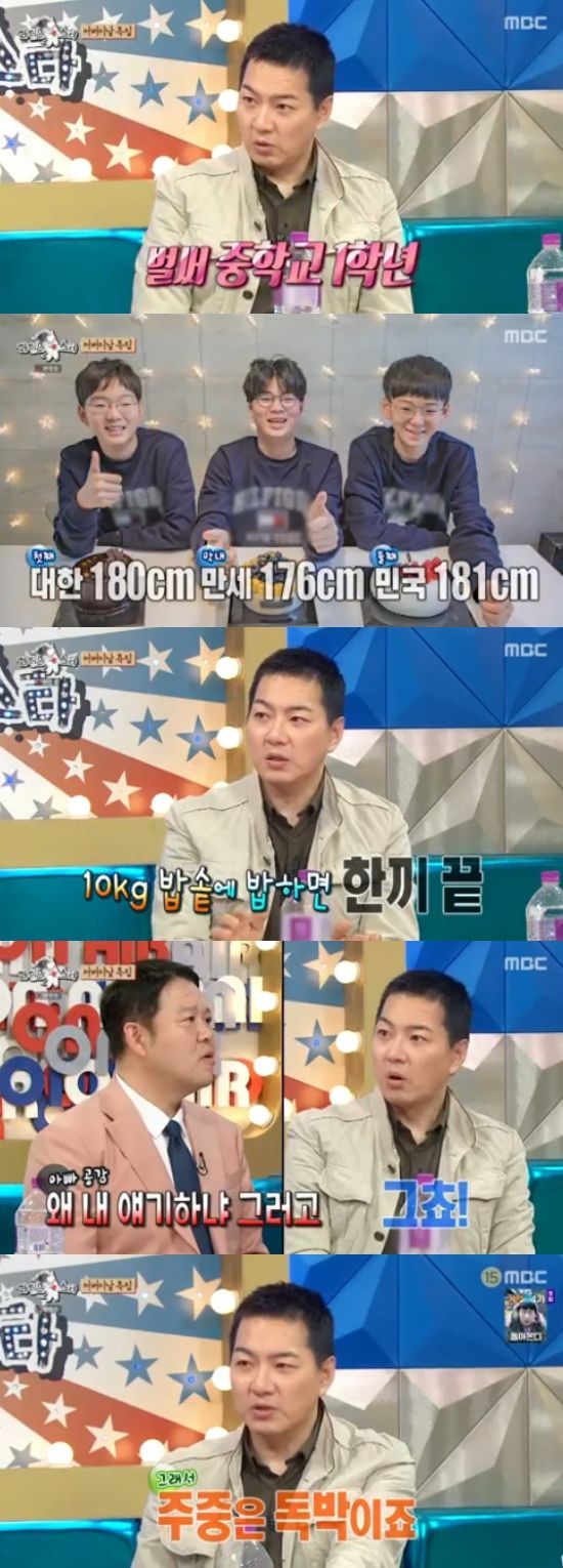 이날 방송에서 송일국은 벌써 중학교 1학년이 된 삼둥이 대한, 민국, 만세를 언급했다. 송일국은 "대한이가 180cm, 민국이가 181cm, 만세가 176cm다. 그런데 몸무게는 만세가 10kg이 더 나간다. 만세가 저랑 체격이 비슷하다"고 했다.