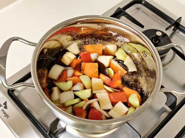보글보글 끓기 시작하면 채소를 넣어요.