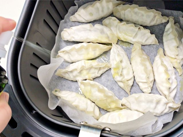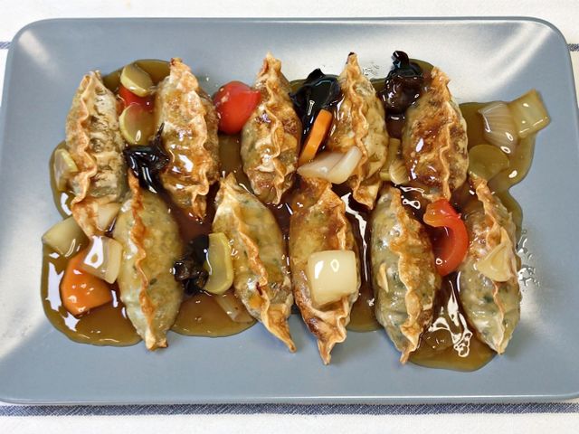 바삭하게 구워진 만두 위에