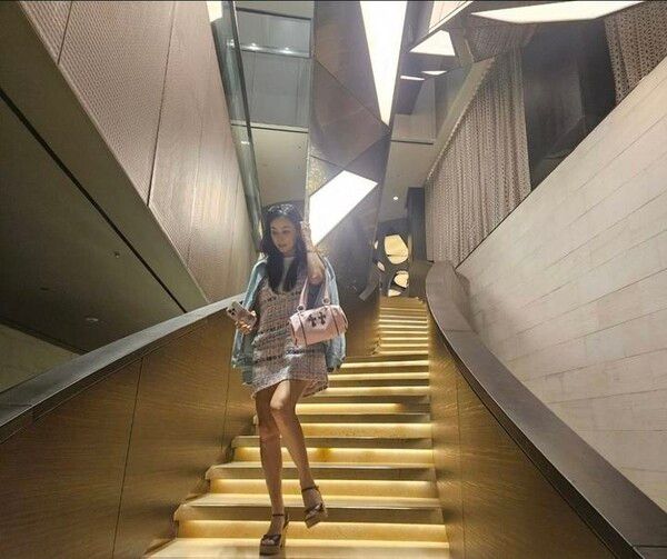 금빛 조명이 비치는 계단에서 독보적인 아우라를 발산했다. 늘씬한 각선미도 이목을 끌었다.