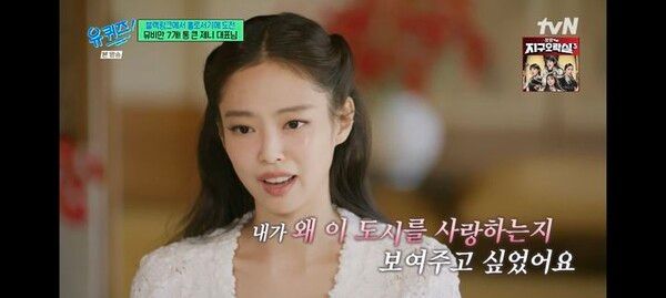 뉴시스 보도에 따르면, 제니는 7일 방송된 tvN 토크 예능물 '유 퀴즈 온 더 블럭'에서 자신의 솔로 정규 1집 '루비'에 실린 곡 '서울 시티(Seoul City)'를 소개하면서 이렇게 밝혔다.