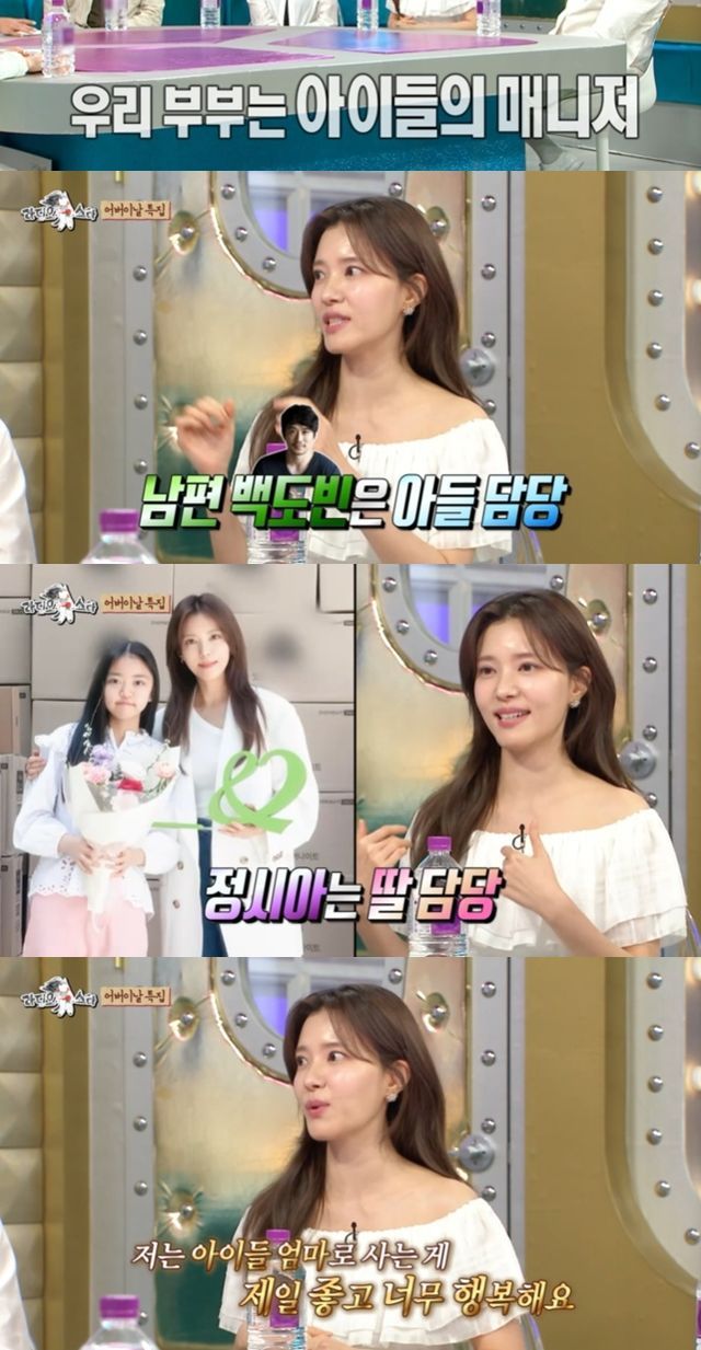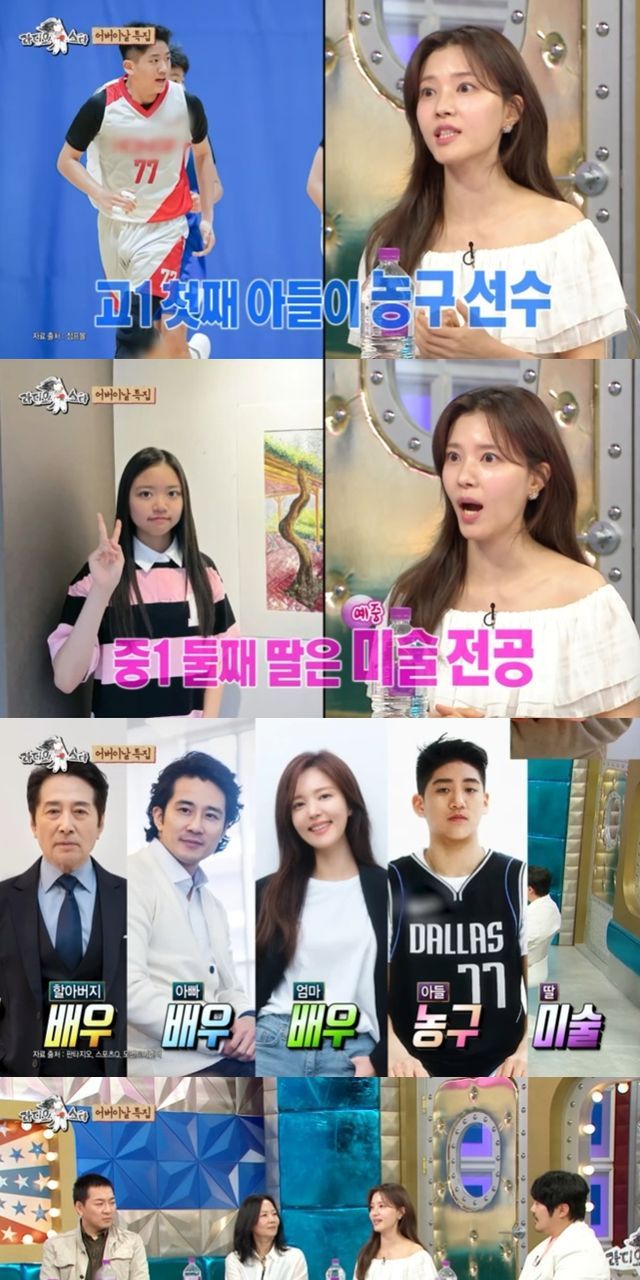 '애둘맘' 정시아는 "고1 첫째 아들이 엘리트 농구 선수다. 둘째는 예중에서 미술 전공을 하고 있다. 다들 예술가 집안이라고 하더라. 남편과 나는 거의 아이들 매니저다. 남편은 아들을 담당한다. 학교가 머니 라이딩해주고 경기할 때 가고 재활할 때 다 따라다닌다. 난 둘째 담당이다. 미술 쪽을 봐주고 있다. 아이들 엄마로 사는 게 제일 좋고 너무 행복하다"라며 흐뭇해했다.
