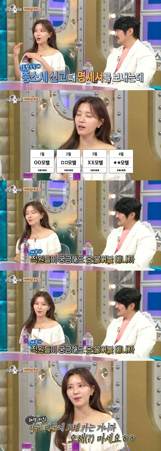 정시아는 "운동을 하면 지방으로 경기를 많이 다닌다. 3월부터 춘계 추계 전국체전, 연맹회장기, 협회장기 다 있다. 오늘 녹화 끝나고도 통영으로 내려가야 한다. 응원을 하러 가면 모텔에서 숙박 생활을 하는 거다. 종합소득세 신고 때 카드내역을 보내는데 매달 모텔이 있으니까 직원들이 '정시아는 왜 매일 모텔을 다녀'라고 할 거 같다. 아들 때문에 가는 거니까 오해하지 마시라"라고 당부해 웃음을 자아냈다.