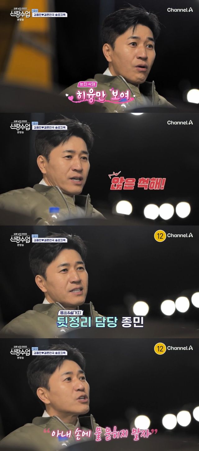 이승철이 결혼 일주일 차인데 싸운 적이 있냐고 묻자 김종민은 "아직까진 없다"면서도 "혼나는 건 일상, 지적은 많이 받는다"고 답해 웃음을 자아냈다.