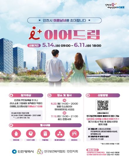 ‘아이() 플러스 이어드림’은 인천형 출생정책의 일환으로, 결혼을 희망하는 인천의 미혼남녀들이 새로운 인연을 만들 수 있도록 돕는 프로그램이다. 6월부터 11월까지 총 5회에 걸쳐 460여 명의 미혼남녀가 참여할 예정이다.