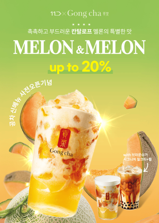 먼저, 11번가의 그랜드십일절 프로모션을 통해 5월 8일부터 14일까지 7일간 디지털 상품권 1만원권과 제품 교환권을 각각 15%, 20% 할인된 가격으로 판매한다. 제품 교환권은 최근 출시돼 많은 인기를 끌고 있는 ‘브라운슈가 시그니처 밀크티+펄’과 곧 출시를 앞두고 있는 신메뉴 ‘멜론멜론 젤리 밀크티’, ‘멜론멜론 젤리 크러쉬’로 구성됐다. 신메뉴 멜론멜론 시리즈 2종은 5월 14일부터 사용 가능하며, 상큼한 노란빛 비주얼로 출시 전부터 소비자들의 기대감을 모으고 있다.