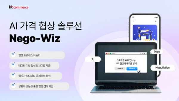 [한스경제=박정현 기자] KT커머스는 인공지능(AI) 가격 협상 솔루션 '네고 위즈'를 자사 통합구매대행 서비스에 도입한다고 8일 밝혔다.