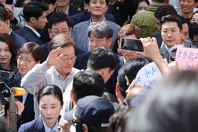 이재명 더불어민주당 대통령 후보가 2차 골목골목 경청투어 마지막 날인 지난 7일 오후 전북 익산시 대한노인회 익산지회에서 간담회에 참석하기 전 시민들을 향해 인사하고 있다 / 뉴스1