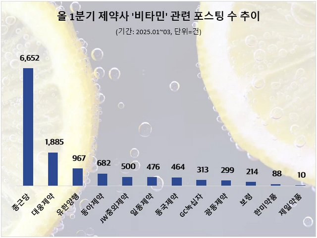 데이터앤리서치 관계자는 "지난 1분기 12개 제약사 비타민 관련 포스팅 수는 총 1만2550건으로 전년 대비 433건, 3.57% 늘었다"면서 "어려운 시기임에도 건강을 챙기는 사람들이 늘고 있다는 방증"이라고 전했다.