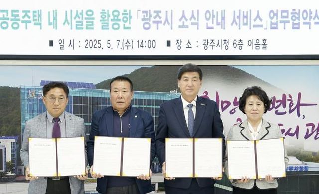 [파이낸셜경제=김영란 기자] 광주시는 지난 7일 시청 이음홀에서 지역 내 아파트연합회들과 ‘공동주택 내 시설을 활용한 소식 안내 서비스’ 업무협약을 체결했다.