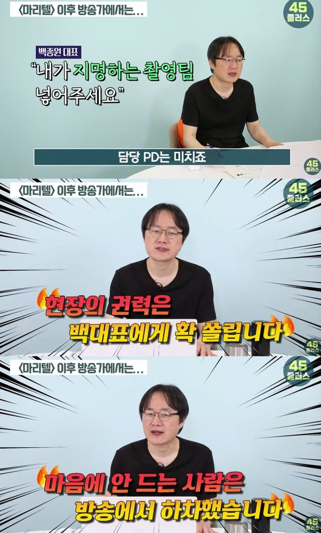 이어 김재환 PD는 "(백종원이) 프로그램에 내가 지명하는 작가팀, 촬영팀을 넣으라고 한다더라. PD는 미친다. 프로그램 분위기는 PD와 촬영팀 호흡이 중요하다"며 "백종원이 데려 온 촬영 팀이 백대표 심기만 살피면 현장 권력은 백종원에게 쏠린다"고 설명했다.
