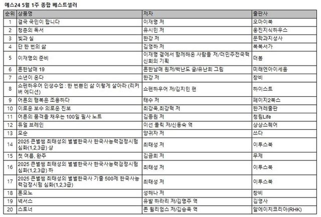 '결국 국민이 합니다'는 이재명 후보의 인생과 정치철학을 담은 책으로, 출간과 동시에 종합 베스트셀러 1위를 차지하며 인기를 입증했다. 유시민 작가의 '청춘의 독서' 특별증보판과 한강 작가의 신작 에세이 '빛과 실'이 각각 2위와 3위를 기록했으며, 김영하 작가의 산문 '단 한 번의 삶', 이재명 후보 참모들의 동행기 '이재명의 준비'가 뒤를 이었다.