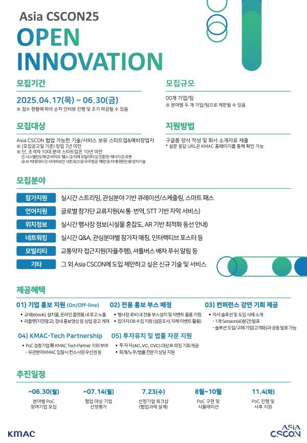 송광호 KMAC 가치혁신그룹장은 “이번 오픈이노베이션 프로그램은 스타트업의 혁신 기술과 대기업의 비즈니스 역량을 결합하는 상생의 플랫폼이 될 것”이라며 “우수 스타트업들이 실질적인 사업 기회를 얻고 시장에서 성공적으로 스케일업할 수 있도록 적극적으로 지원할 것”이라고 말했다.