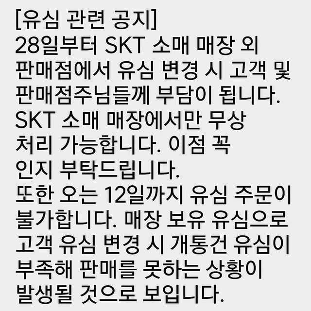 이같은 정책은 지난달 28일 SK텔레콤이 발표한 공지에 따른 것이다. 해당 공지에는 '판매점 보유 유심으로 교체 시 개통용 유심이 부족해 신규 판매가 어렵다'는 내용과 함께 유심 교체 비용을 고객 혹은 판매점주가 부담해야 한다는 조건이 포함됐다.
