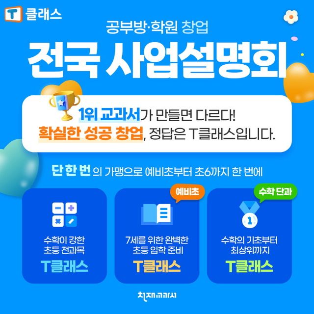 천재교과서가 만든 초등 전문 전 과목 공부방·학원 브랜드 ‘T클래스(티클래스)’가 예비초(7세) 및 수학 단과 론칭을 기념하여 5월 한 달간 전국 오프라인 사업설명회를 진행한다고 8일 밝혔다.