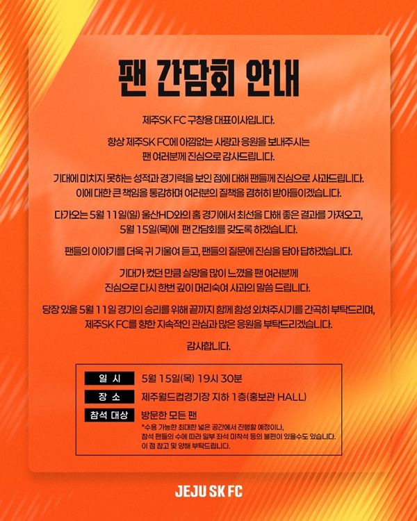 한편 3연패 수렁에 빠진 제주SK는 구단 SNS 구창용 대표이사의 사과문을 발표하고 오는 15일 오후 7시 30분 제주월드컵경기장 지하 1층 홍보관 홀에서 팬 간담회를 갖는다고 밝혔다.