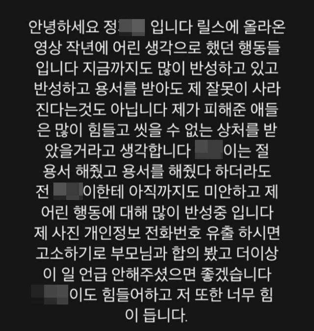 이어 “화가 나신 분들과 피해 학생에게 죄송하다”며 “얌전히 벌을 받고 정신 차리고 살 수 있도록 도와달라”고 덧붙였다. 그러면서도 신상 공개를 계속할 경우 고소하겠다는 내용도 포함했다.