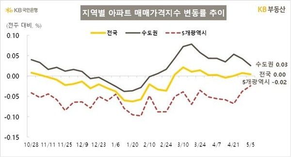 뉴시스 보도에 따르면, 9일 KB부동산의 5월 첫째 주 아파트 시장 동향에 따르면 지난 5일 기준 전국 아파트 매매가격은 0.00%로 보합, 수도권은 0.03% 올랐다. 전국 아파트 매매가격은 지난주 0.01% 소폭 반등한 것을 제외하면 3월부터 보합을 유지하고 있다.