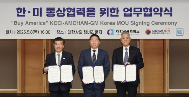 대한상공회의소는 8일 상의회관에서 주한미국상공회의소(AMCHAM Korea), 한국 지엠(GM Korea)과 함께 '바이 아메리카(Buy America) 캠페인'에 협력해 나가기로 했다고 이날 밝혔다. 체결식에는 최태원 대한상의 회장, 제임스김 주한미국상의 회장, 헥터 비자레알 한국지엠 사장, 헤일리 선드 주한미국대사관 상무관 등이 참석했다.