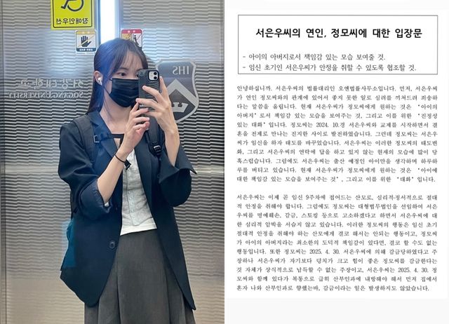법률대리인 측은 이어 서은우가 곧 임신 9주 차에 접어든다며 "심리적, 정서적으로 절대적 안정을 취해야 하는데 정모 씨가 대형 법무법인을 선임해 서은우 씨를 명예훼손, 감금, 스토킹 등으로 고소하겠다며 심리적 압박을 서슴지 않고 있다. 이러한 행동은 임신 초기 산모에게 결코 해서는 안 될 행동이고, 정모 씨가 아이의 아버지라는 최소한의 책임이 있다면 결코 할 수도 없는 행동"이라고 지적했다.