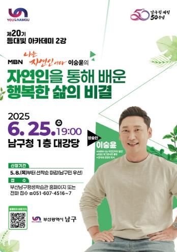 [파이낸셜경제=김영란 기자] 부산 남구는 오는 6월 25일, 남구청 1층 대강당에서 '나는 자연인이다' 프로그램 진행자로 잘 알려진 개그맨 이승윤을 초청하여 제20기 등대빛 아카데미 두 번째 강의를 개최할 예정이다.