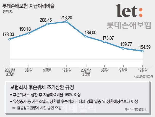 이어 지난 7일 콜옵션 행사를 재차 준비했지만 금융당국이 콜옵션 행사 이후 지급여력비율이 150%에 미달한다는 이유로 불승인 결정을 내렸다. 현행 감독규정은 후순위채 상환 후 킥스 비율이 150% 이상만 조기 상환을 허용한다. 하지만 지난 3월 말 기준 롯데손보의 킥스 비율은 150%에 미달한다. 이런 탓에 롯데손보는 금감원에 비조치의견서를 요청했다. 하지만 금감원은 지난 7일 이를 불승인하고 콜옵션 행사를 하지 말라고 통보했다.