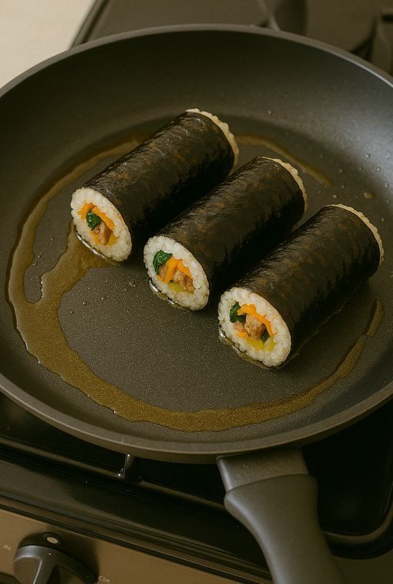 전자레인지의 건조한 열과 달리, 프라이팬에 물을 아주 살짝 두르고 중약불에서 뚜껑을 덮은 채로 데우는 방법도 있다. 팬에 기름을 두르지 않는 것이 포인트다. 수분을 살짝 더해주는 방식으로 속까지 촉촉하게 데워지고, 김밥의 고유한 식감은 그대로 유지된다. 물이 너무 많으면 김이 눅눅해질 수 있으니 물은 한두 숟가락 정도면 충분하다. 조리 중에는 팬을 너무 뜨겁게 하지 않아야 한다. 바닥이 타지 않게 주의하면서 데우면, 마치 갓 만든 김밥처럼 부드럽고 따뜻하게 즐길 수 있다.
