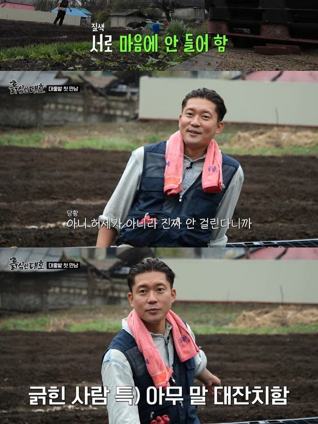 이날 공개된 첫 화에서 김대호는 밭갈이를 마친 후 바로 비닐 작업에 나서려고 했다.