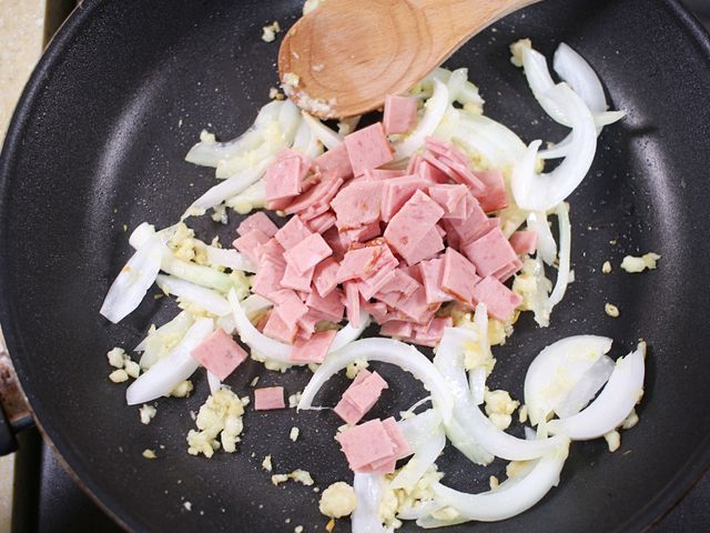 작게 썬 슬라이스햄도 넣어서 볶아주세요.